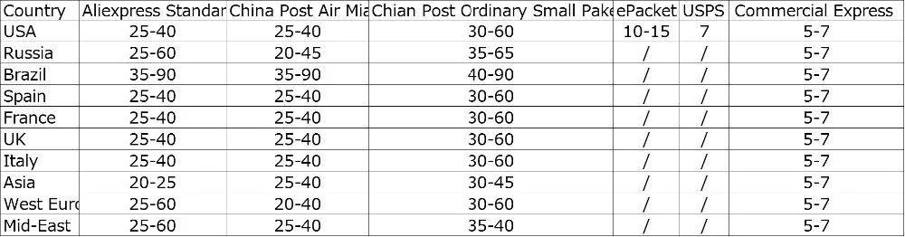 | Africa | 15-45 Business days |